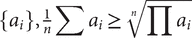 arithmetic-geometric mean inequality The arithmetic mean of a set of non-negative numbers is never less than their geometric mean. So for any Generally, for a set of numbers with equality if and only if all take the same value. This inequality is often abbreviated to AM-GM.
