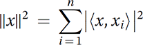 for a orthonormal basis x1, x2, …, xn of a finite-dimensional inner product space X and x∈X. This is a generalization of Pythagoras' Theorem. The identity holds for an orthonormal sequence in an infinite-dimensional Hilbert space if and only if the sequence is complete, or equivalently, a Schauder basis. Compare Bessel's inequality. |